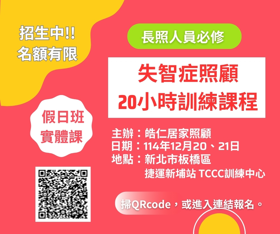 長照人員必修【失智症照顧20小時】特殊訓練課∣招生中!