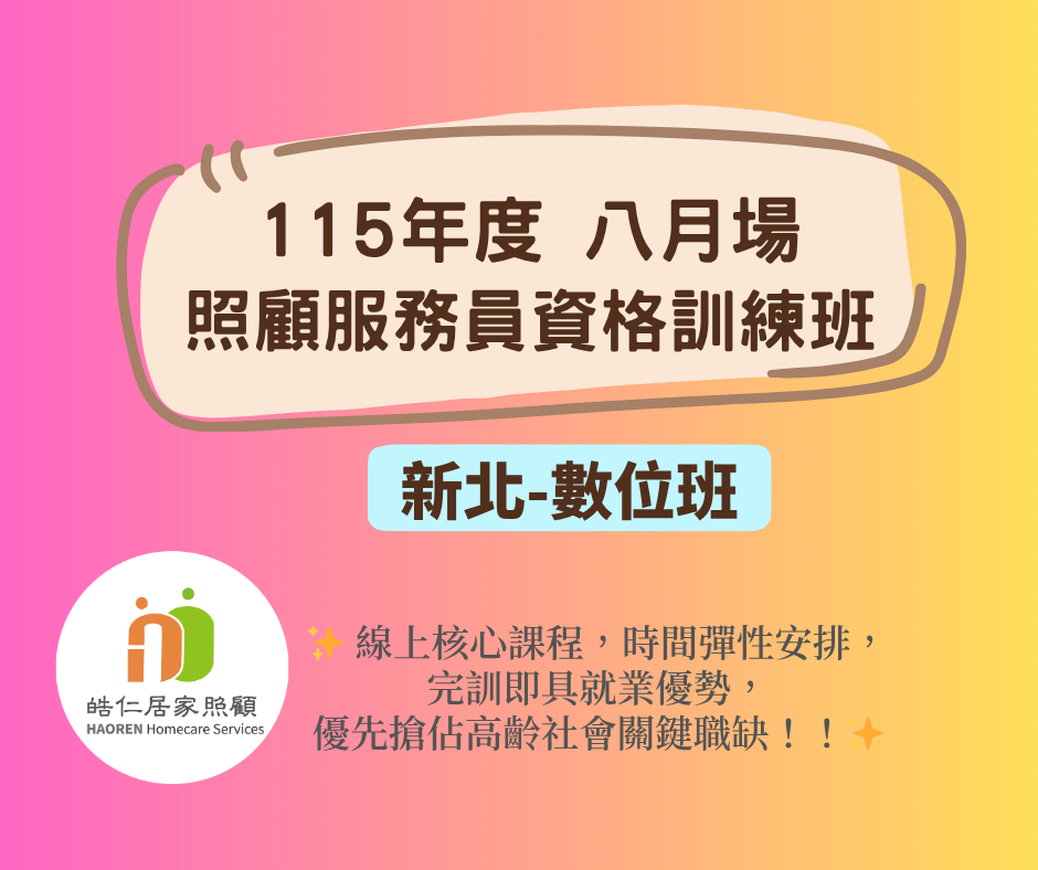 皓仁居家照顧 115年度【新北市照顧服務員資格訓練課程-平日數位班】線上報名